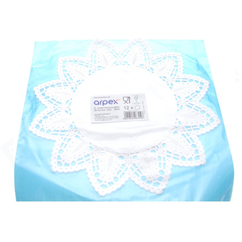 Serwetka dekoracyjna, biała o średnicy 24 cm, 12 sztuk w opakowaniu.