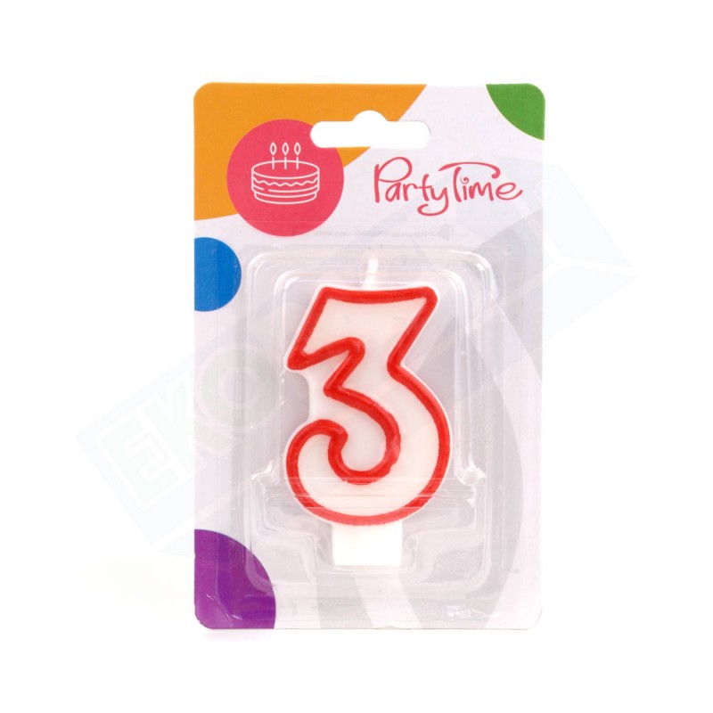 Świeczka urodzinowa w kształcie cyferki 3 biała z czerwoną obwódką. Wspaniała dekoracja która uświetni każde urodziny.