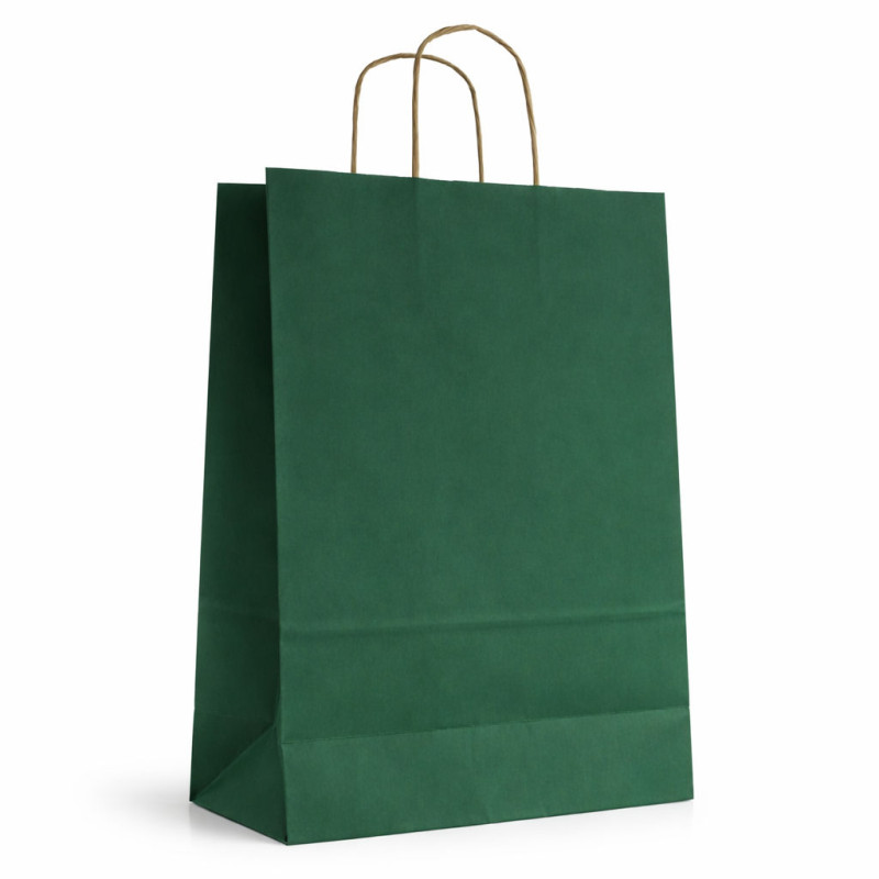 Torba papierowa, zielona, ekologiczna ze skręcanym uchwytem jest idealnym opakowaniem na produkty i materiały reklamowe. Świetnie sprawdza się do przenoszenia zakupów. Jest wykonana solidnie i estetycznie, dlatego torba może być wykorzystywana jako opakowanie na upominki dla najbliższych.